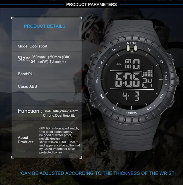 Digital watch: Fashionable sporty dial design, military style outlook. Big numbers display with light and large dial, show time clear even in the dark. Use import EL Lamp, press "LIGHT" button to see the time clearly in the light, easy to read.